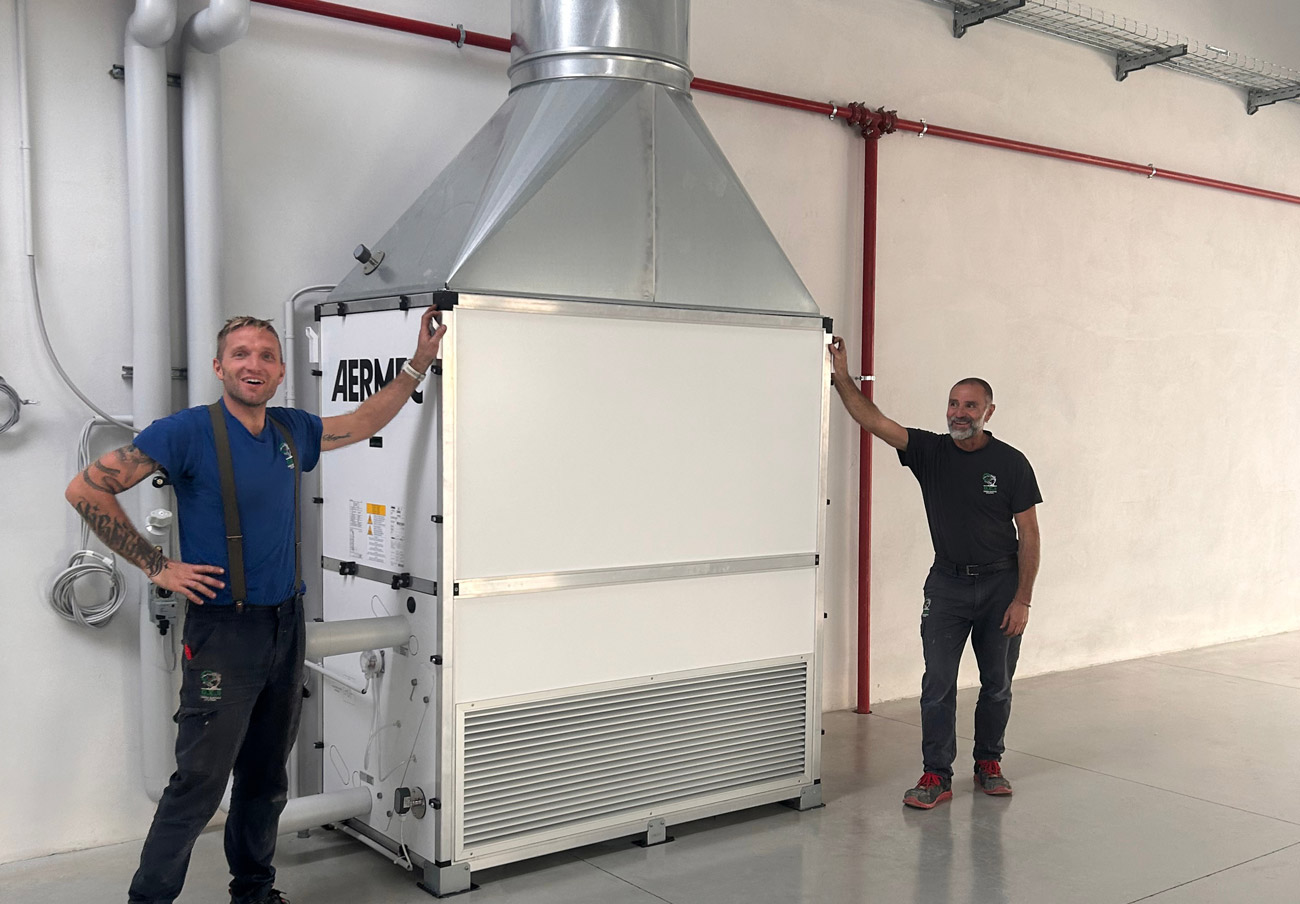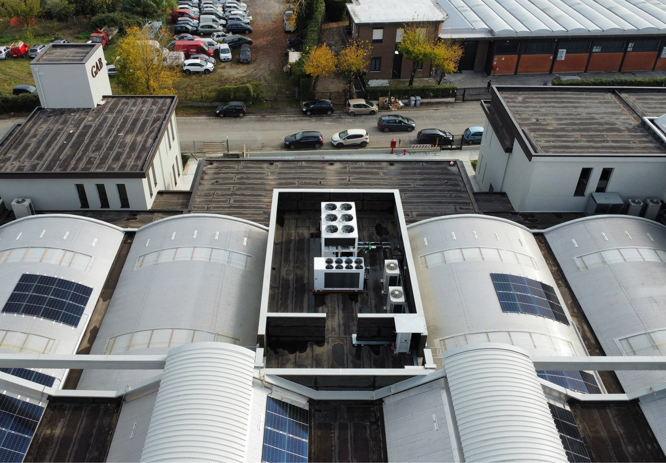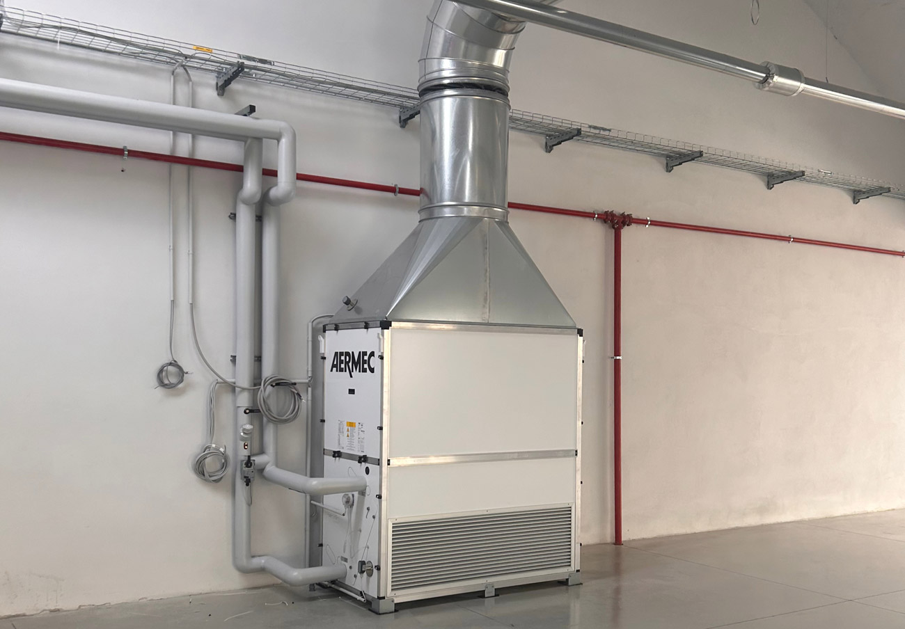 L’impianto è dotato di un sistema di riscaldamento e raffreddamento con una potenza di 640 kW. Questo impianto utilizza una pompa di calore aria/acqua, sfruttando l’energia termica presente nell’aria per garantire un efficiente scambio termico all’interno del processo.