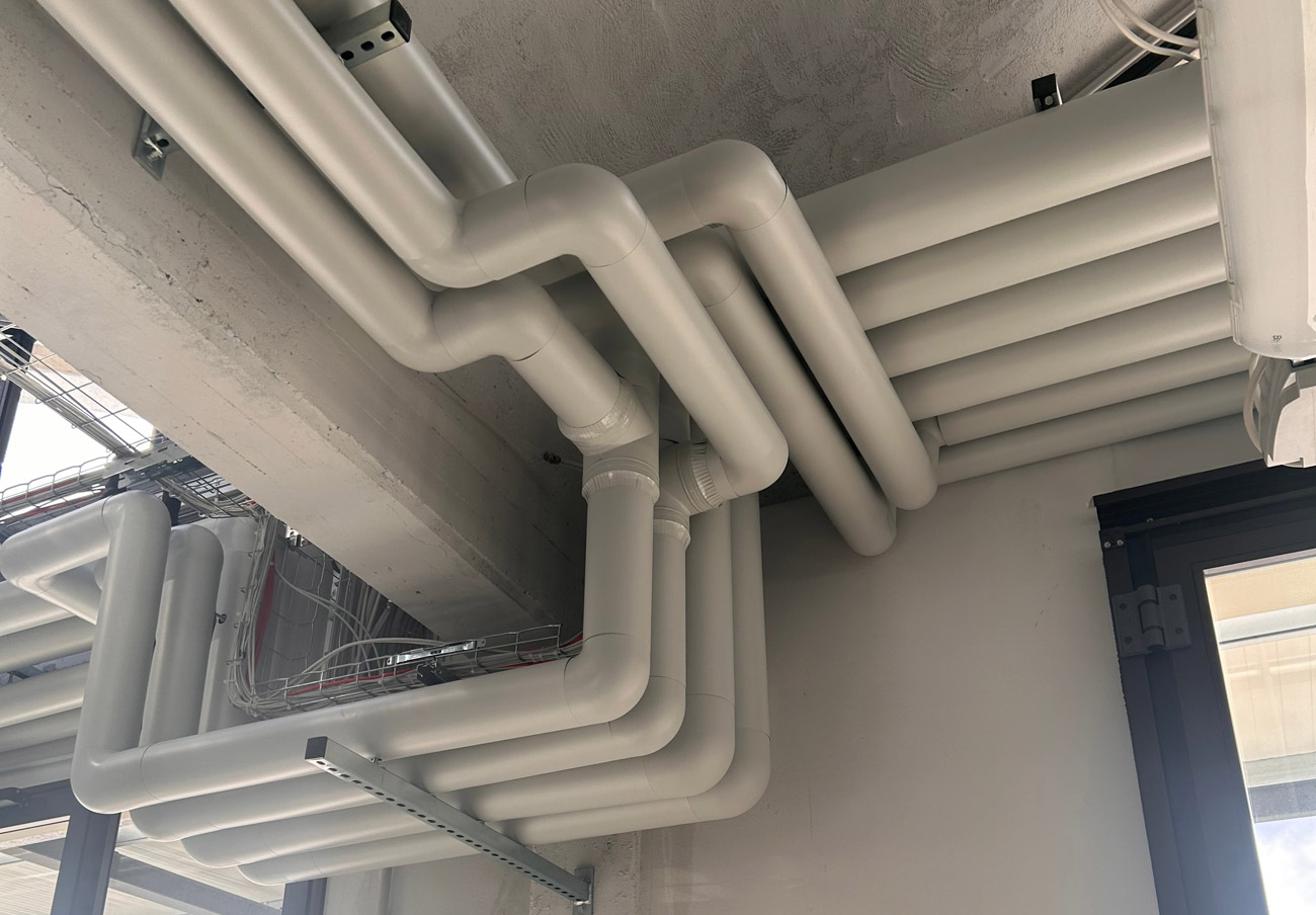 Impianto che utilizza una pompa di calore aria/acqua, con un impianto idronico interno caratterizzato da terminali UTA e tubazioni in acciaio microforato per garantire un efficiente riscaldamento e raffreddamento dell’ambiente.
